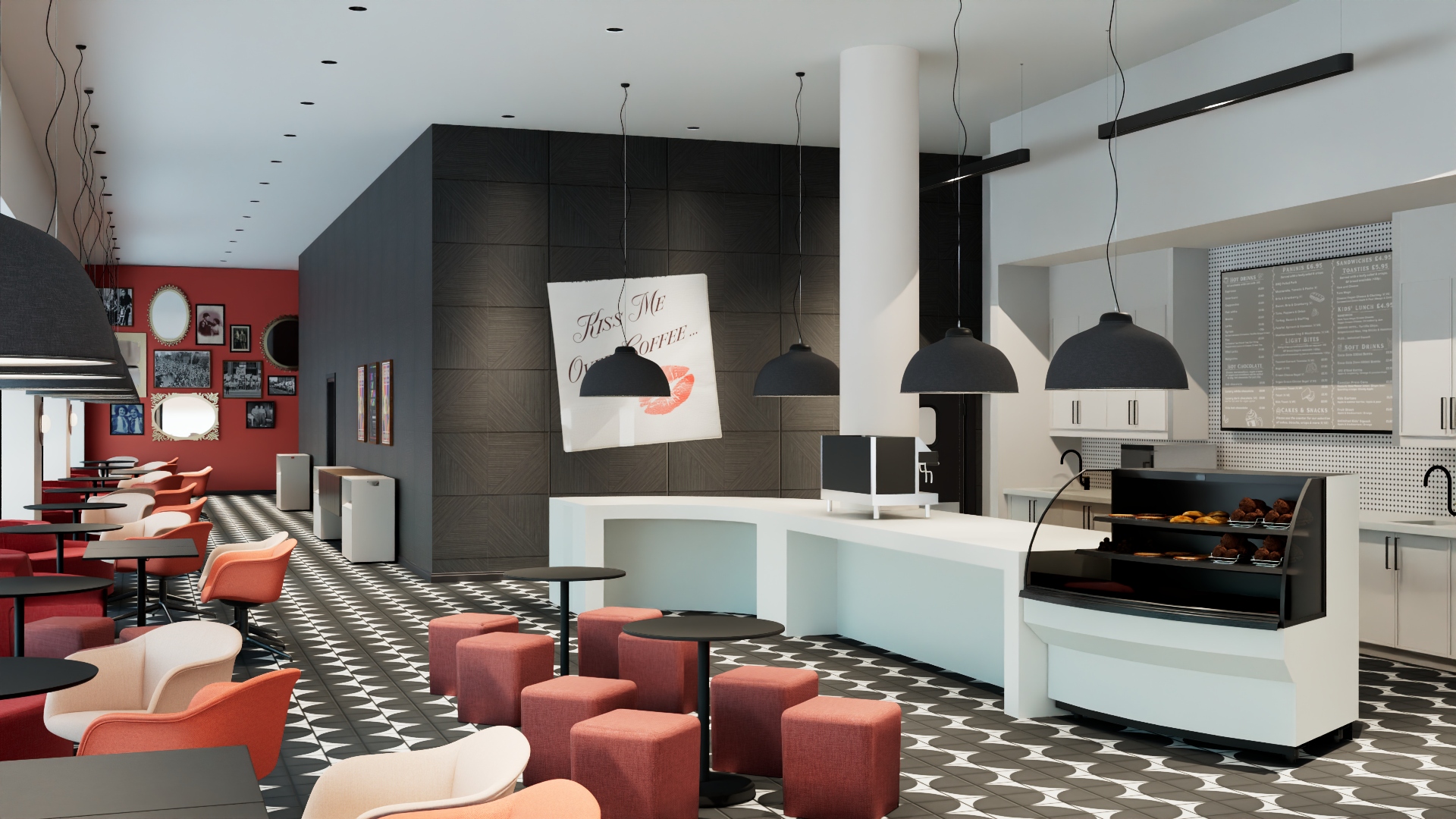Envisioned as a not-for-profit, this centre celebrates the 2Slbtq+ community by providing environments fostering safety, diversity, freedom of expression, and social connection. I wanted the interiors to be bold and edgy - loosely referential of Studio 54 and the 70's. Named Fluid+, as a nod to gender and sexual fluidity is expressed through the soft, sinuous forms of the furniture, lighting and cafe floor tile; while lipstick and eyeshadow shades inspired the colour palettes. Gallery walls feature local queer artists and queer history through B&W photography.