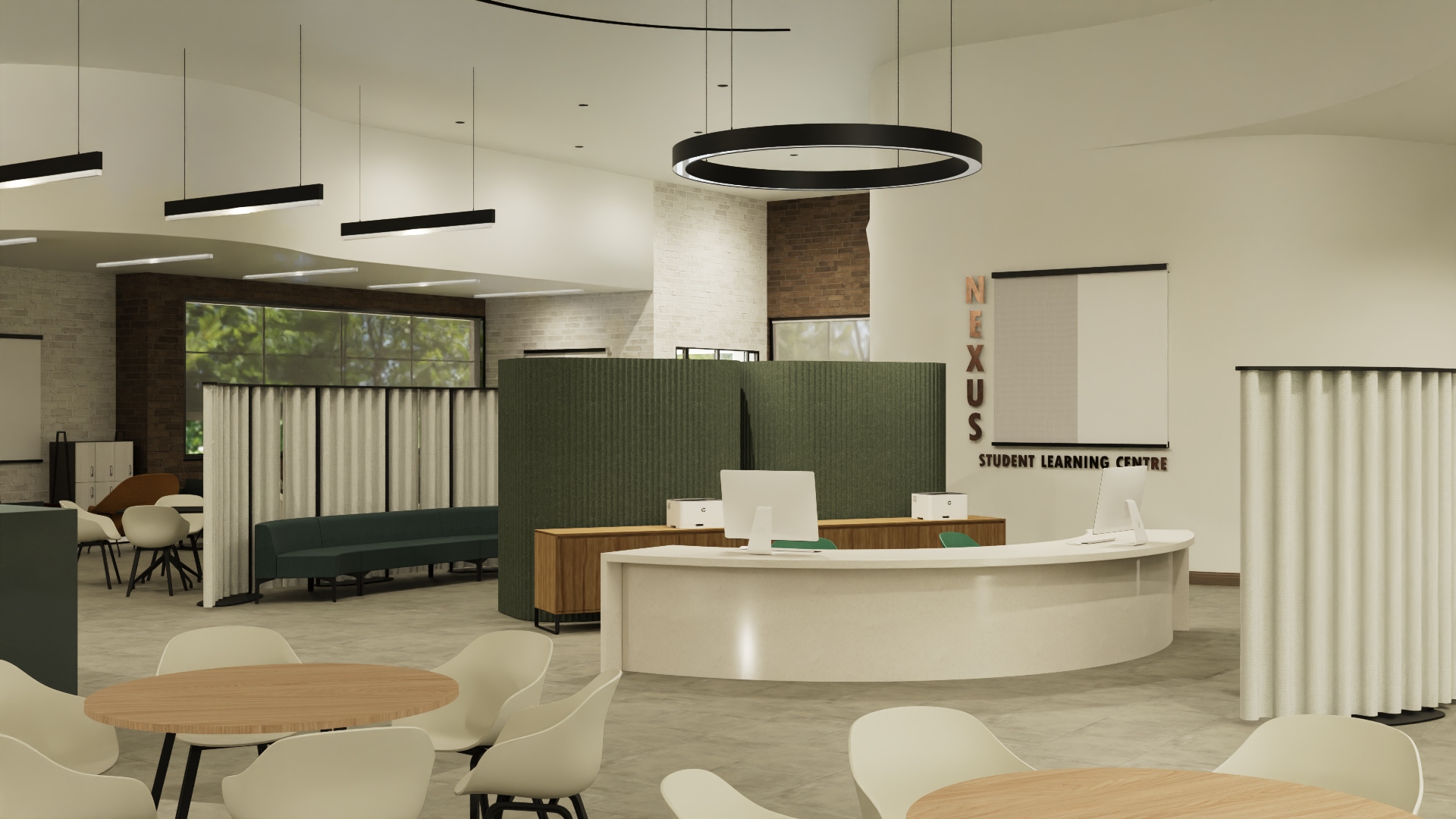 Featuring soft, sinuous forms which guide the user throughout the space, Nexus, caters to unique learning styles with zones branching off a central reception hub. A mix of movable tables and chairs support collaborative learning, while screened work pods offer privacy for the individual.